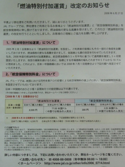 2008年7月1日から燃油特別付加運賃が、またまた値上がりします。現行6,500円から8,500円になります。これは1区間の運賃なので、往復だと17,000円(=1,130元)。
