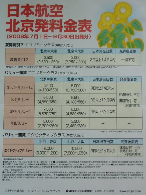 先日JAL日本航空北京支店に行って、7月1日以降の割引運賃を調べてきました。