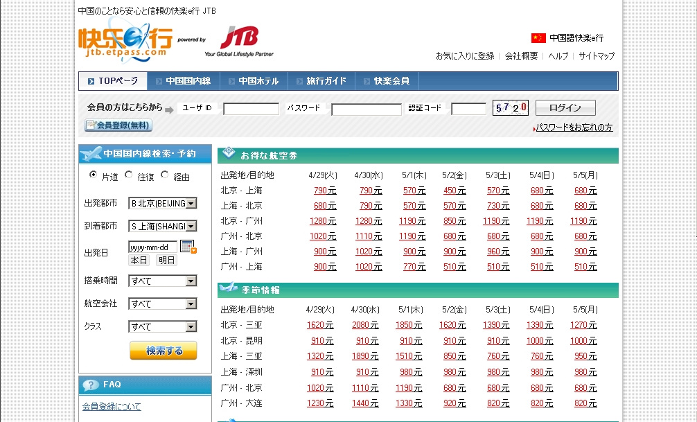 JTBの「快楽e行」というサイトがオープンしました。完全日本語対応の中国国内線航空券のサイトです。