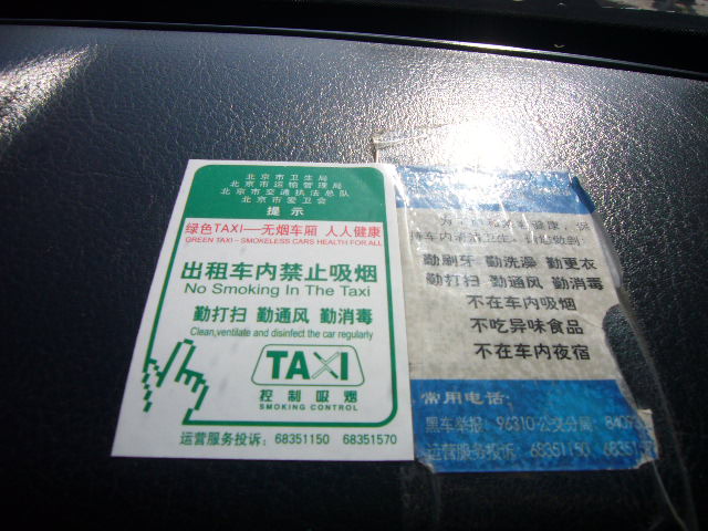 2008年の北京オリンピックを控え、2007年10月より北京のタクシー車内での喫煙が禁止されます。運転手も乗客も同様に100元〜200元の罰金が科せられます。