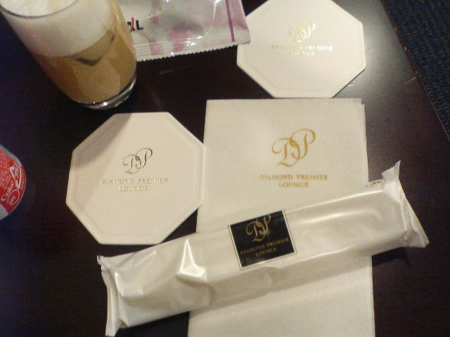 プレミアラウンジ専用のコースター、紙おしぼり、紙ナプキン。こういうところにしっかりとお金をかけてくれるのはANAには無いサービスですね。